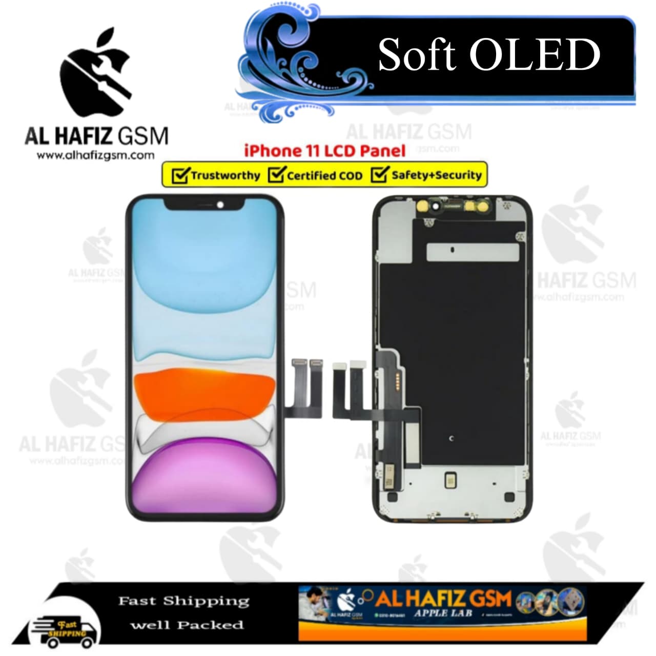 The iPhone 11 was originally released with an LCD display, not an OLED screen. A “soft OLED display for iPhone 11” is an aftermarket replacement part that upgrades the phone’s original Liquid Crystal Display (LCD) to a more advanced Organic Light-Emitting Diode (OLED) screen.